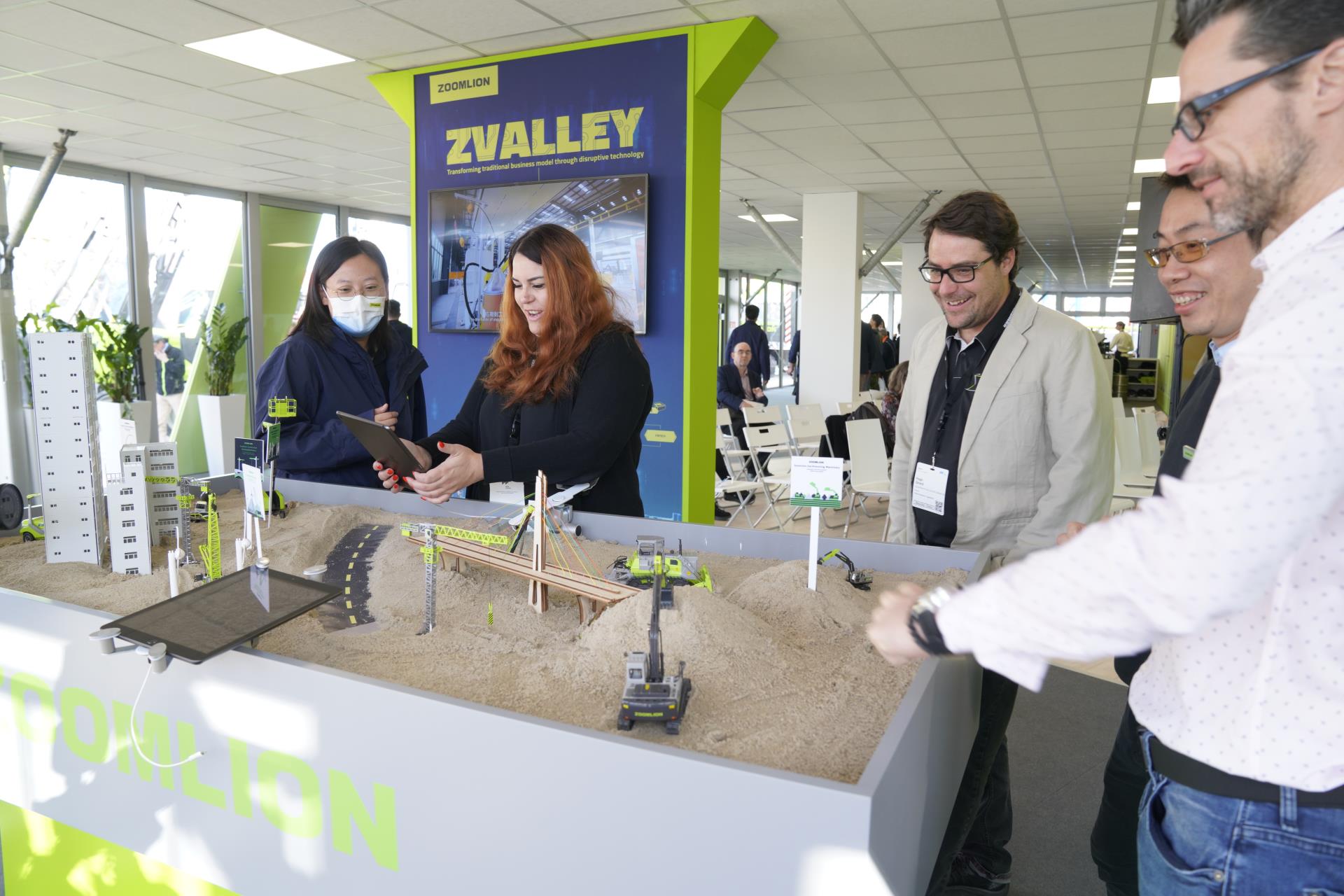 在展区一楼的互动体验区,中联重科打造了微景观建筑 宅男影视,通过实景VR对海外大型工程项目进行三维虚拟精确设计和施工模拟,让观众近距离感受工程机械工况和操作体验,还有互动PK赛,现场扫码打卡赢好礼等各种互动体验版块和LED互动屏,让观众更好地体验和感受到中联重科的新科技,新成果, 。