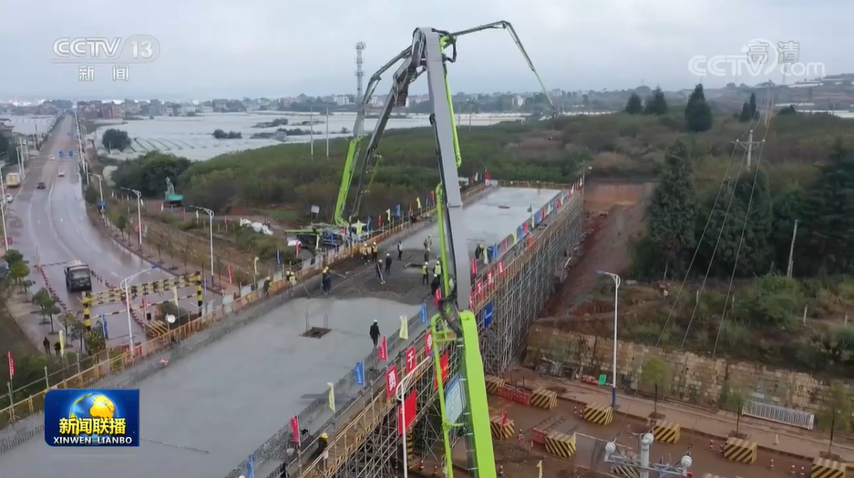 ▲中联重科泵车正在项目现场进行施工(图片来源:央视新闻)